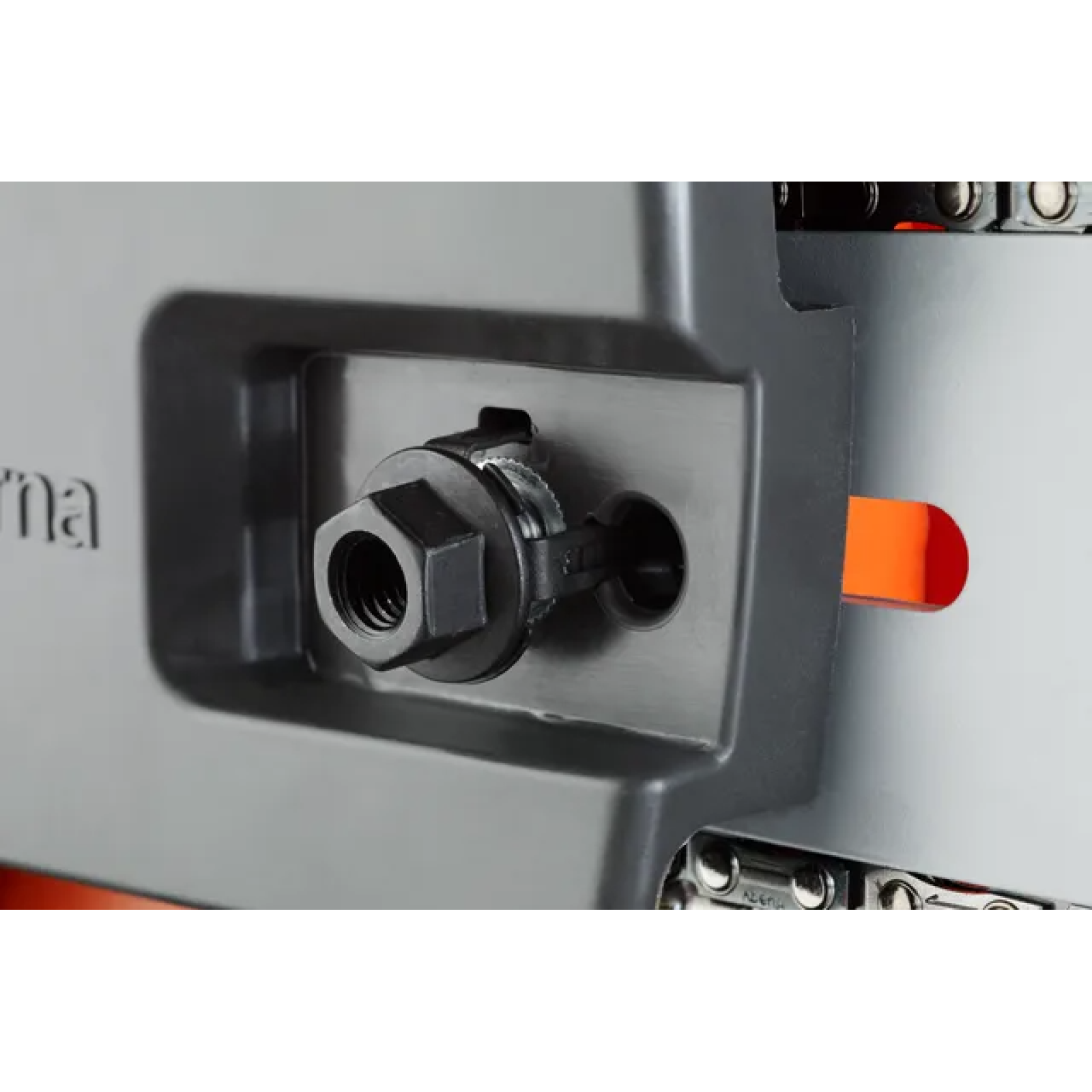 Откидная крышка топливного бака позволяет без затруднений открывать и закрывать его даже в толстых перчатках. Обновлённый картер, изготовленный из комбинации металла и пластика, отличается повышенной прочностью, устойчивостью и длительным ресурсом. Дополнительно работу упрощают цветные метки для точного направления валки и гайки шины, которые остаются на месте и не теряются.
