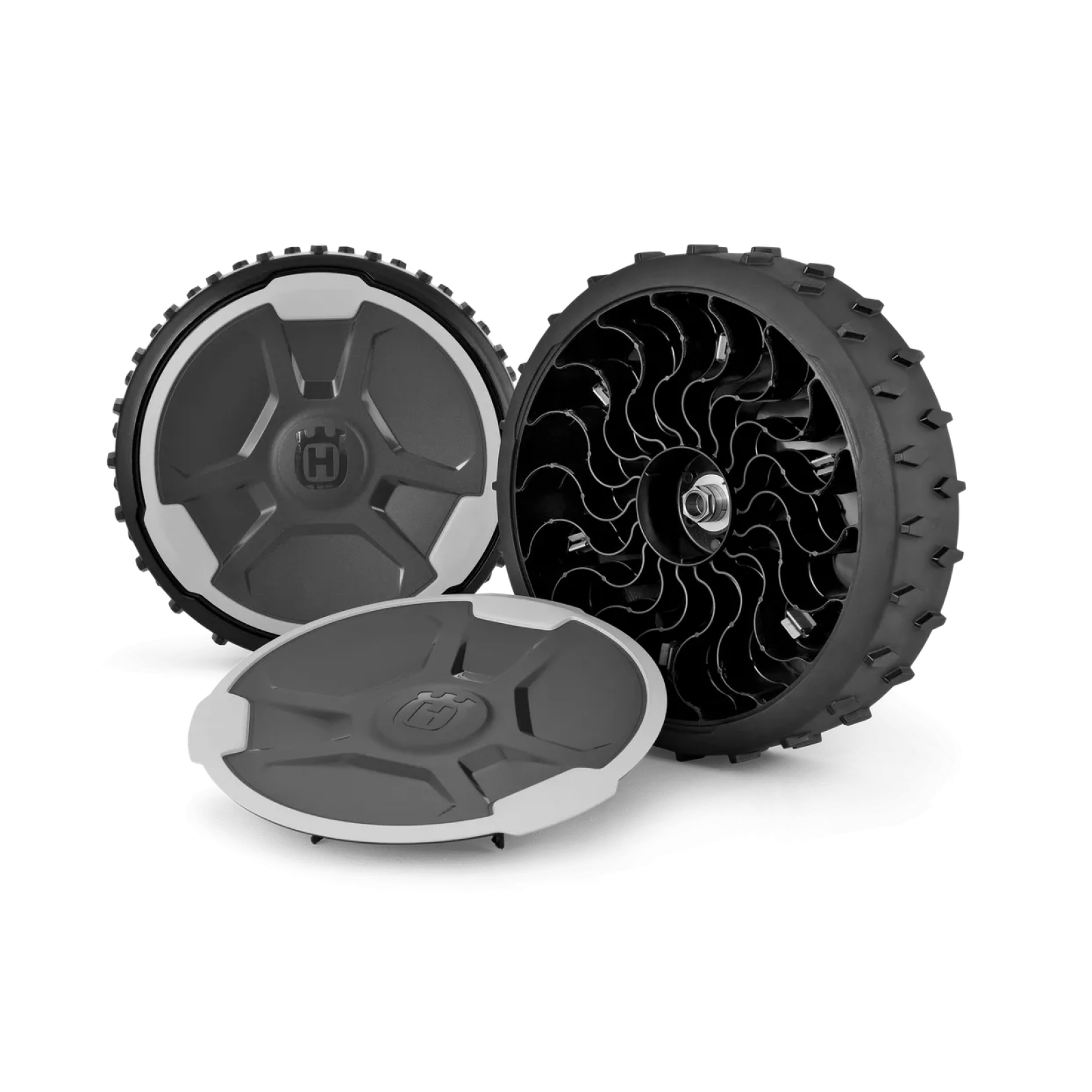 Колёса повышенной проходимости Husqvarna CEORA™ обеспечивают лучшее сцепление на неровных и наклонных участках газона, что позволяет повысить эффективность работы CEORA™. В зависимости от состояния дерна и погодных условий прирост производительности на склонах может составлять около 5%. В комплект входят два рельефных колеса, цанги и колпаки.