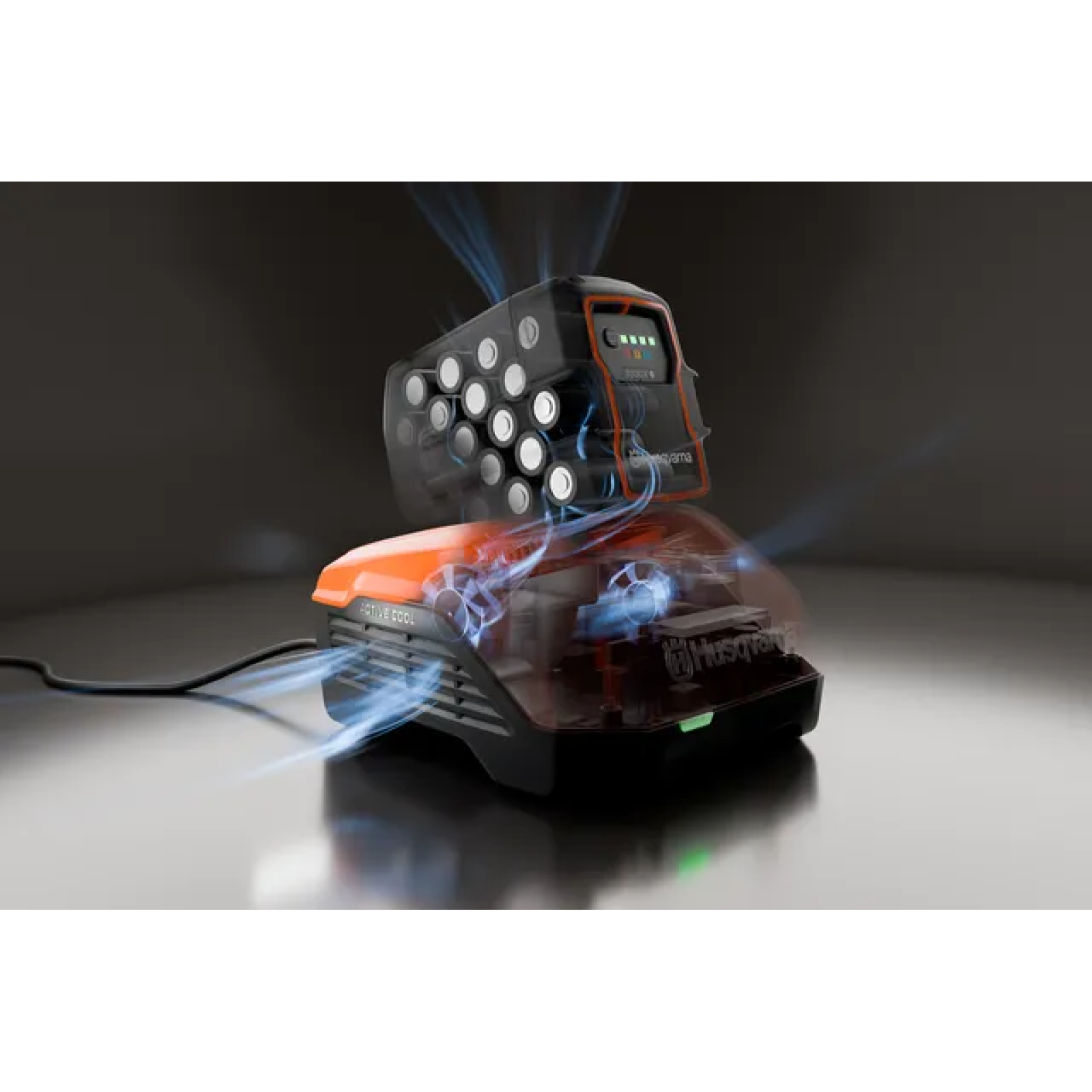 Зарядное устройство Husqvarna 40-C750X – это мощный инструмент для быстрого восстановления заряда аккумуляторов большой емкости, разработанный для гибкой аккумуляторной системы Husqvarna BLi-X на 36 В. Модель обеспечивает мощность зарядки 750 Вт и оснащена технологией ActiveCool – активным воздушным охлаждением со встроенными вентиляторами, что позволяет быстро заряжать даже вместительные батареи без длительных пауз на охлаждение.